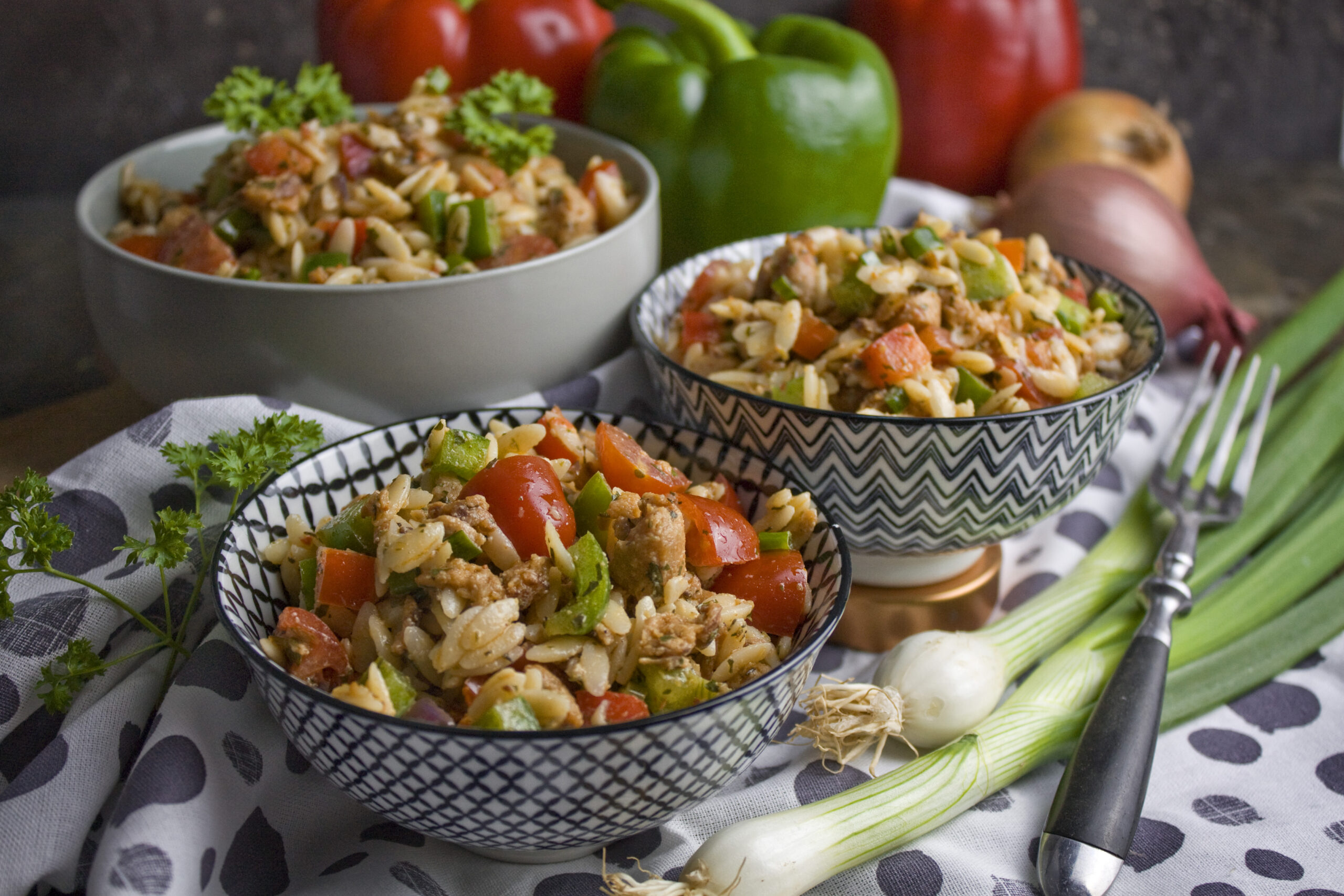 - In der Zwischenzeit das restliche Gemüse klein schneiden. Dann zusammen mit den Kritharaki in eine Schüssel geben und grob vermengen.